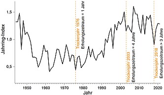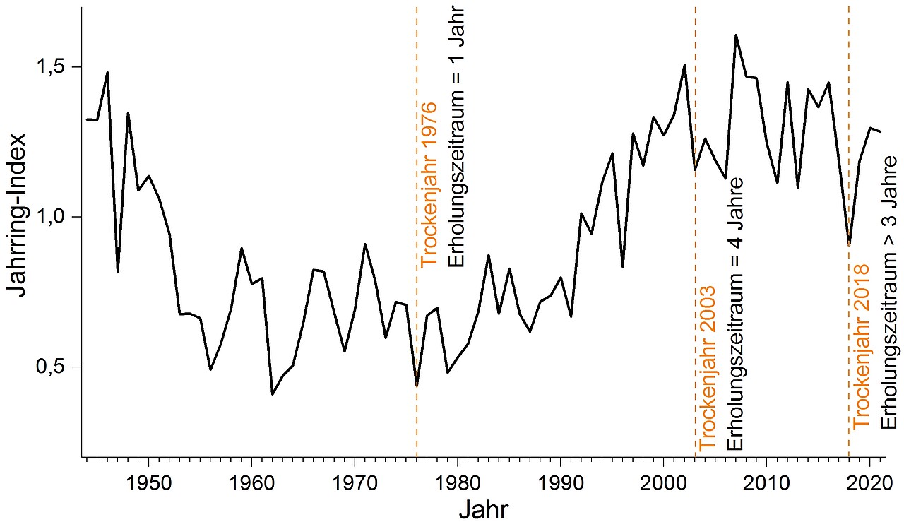 Mittels Resistenz-Indizes sowie weiterer Kenngrößen (z.B. Erholungszeitraum nach Extremereignis) werden unter anderem Zuwachsdepressionen während des Stressjahres, die Erholungsfähigkeit und die Rückschwingung des Systems in die Ausgangslage ermittelt. Hieraus lässt sich ableiten, wie die Douglasien am Standort bzw. in einer Region auf zukünftige Wetterextreme reagieren könnten bzw. welche Auswirkungen diese auf das Wachstum haben. Bekannte Trockenjahre (1921, 1962, 1976, 2003, 2018) stehen hierbei im Fokus, da solche Trockenereignisse zukünftig vermehrt prognostiziert sind.