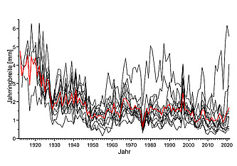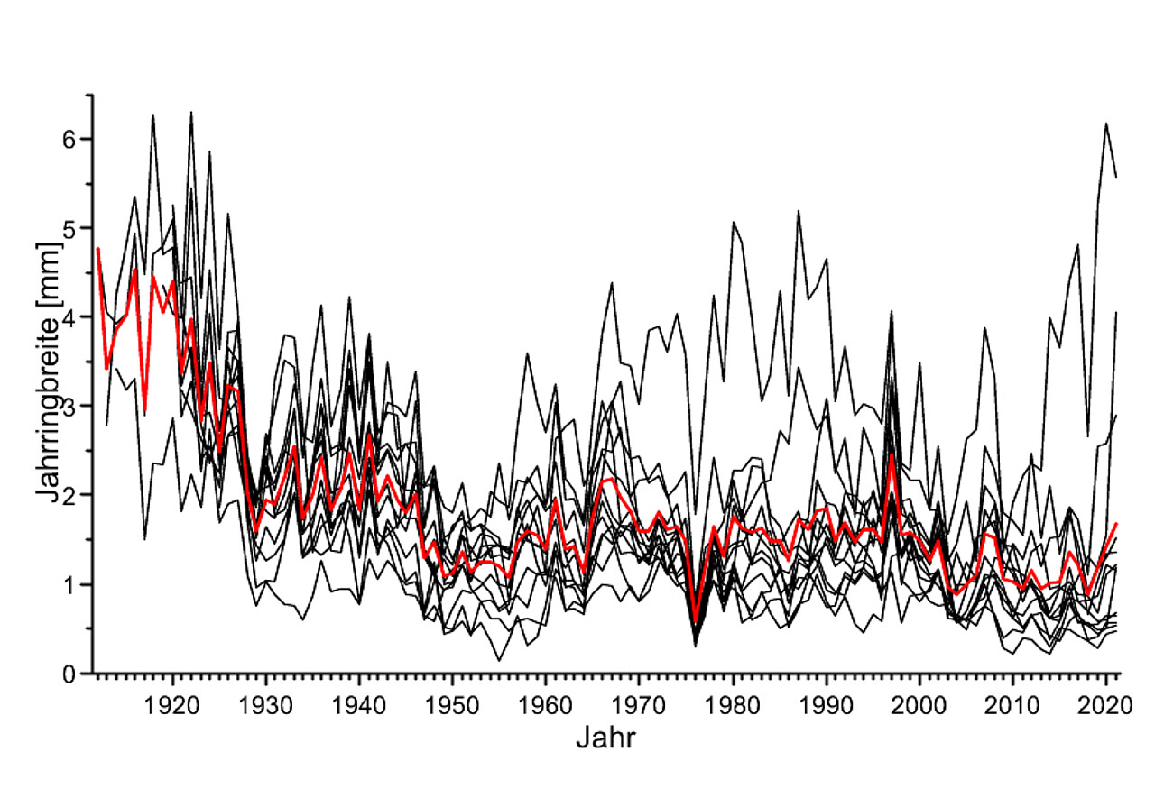 Die Baummittelkurven (Jahrringserien) werden herangezogen, um die zeitliche Dynamik des radialen Stammwachstums zu analysieren. Veränderungen der kurz-, mittel- und langfristigen Wuchsleistung können erkannt werden und lassen Rückschlüsse auf Veränderungen der Ertragsleistung zu.