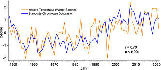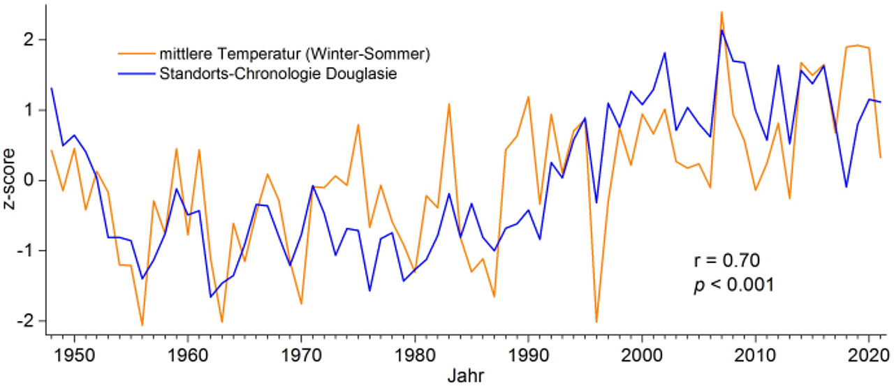 Die Analysen zur Klima-Wuchssensitivität basieren auf Jahrringserien (Baummittelkurven).