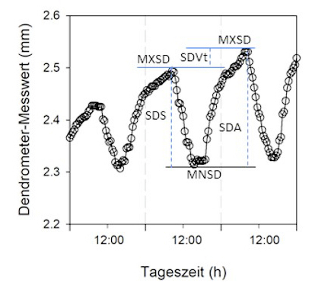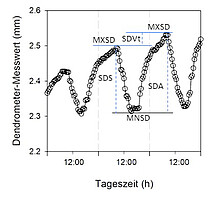 Der Effekt des Standortklimas auf die laufende Veränderung der Stammdicke von Baumarten wird mit hochauflösenden elektronischen Dendrometern untersucht. Die der Radialveränderung von Stämmen zugrunde liegenden Prozesse (kambiale Zellteilung, hydraturbedingte diurnale Volumenänderung von Phloem und Xylem) laufen innerhalb von Stunden und Tagen ab. Die tägliche Veränderung des Stammradius wird als Differenz zwischen den maximalen Stammradien zweier aufeinanderfolgender Tage berechnet. Diese Werte werden ebenfalls mit mikroklimatischen und Bodenparametern in Beziehung gesetzt. Zeitgleich werden hierzu die Bodenfeuchte im Wurzelraum, das Standortklima und der Xylemwasserfluss im Stamm zeitlich hochauflösend erfasst.